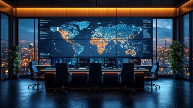 Sleek AI Driven Logistics Control Room Monitoring Global Supply Chains with Digital Maps and Analytics