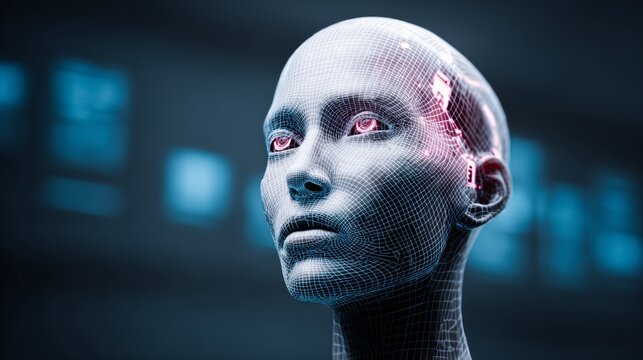 Futuristic digital face with ai elements in virtual cyberspace