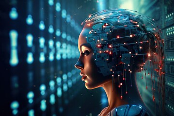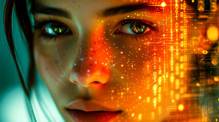 Digital of a woman's face with futuristic face technology, identity scanning, symbolizing futuristic concepts and biometrics.