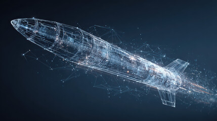 Sleek 3D Wireframe Hologram of Missile Amidst Digital Connections and Data Flow on Dark Blue Gradient
