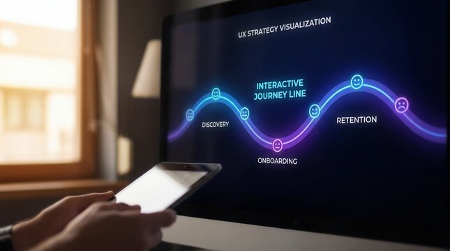 ux strategy visualization glowing neon wave interactive journey line, customer experience map, discovery onboarding retention analytics, digital business technology concept, for web, app, ui.