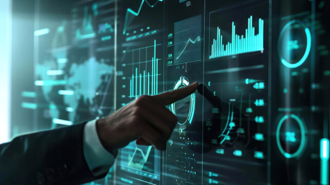A man's hand is seen pointing at modern financial graphs and indicators on a futuristic digital display