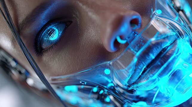 Cybernetic eye with glowing blue iris and intricate mechanical components