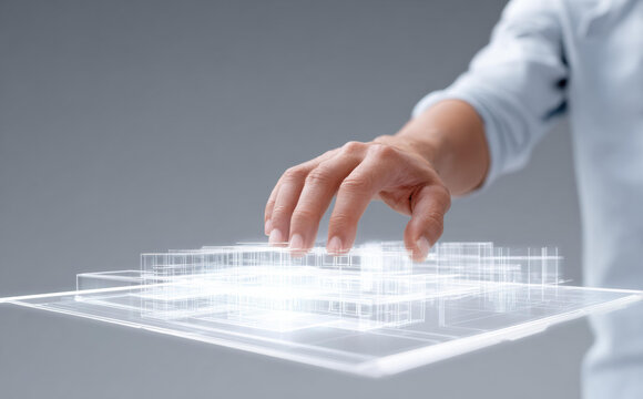 Focused professional architect using futuristic technology. hand touching virtual hologram of building model project, an interactive design on digital interface
