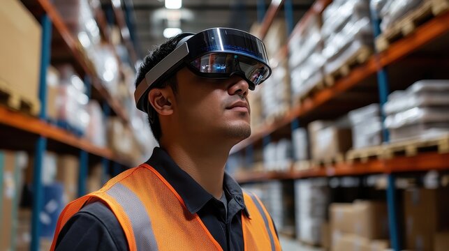 Warehouse worker using augmented reality for inventory management, e-commerce efficiency.