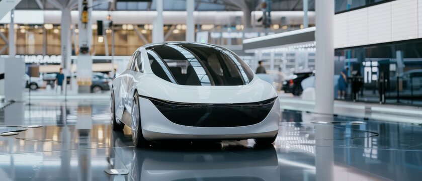 A sleek, futuristic car on display in a modern showroom, highlighting cutting-edge design and innovative automotive technology.