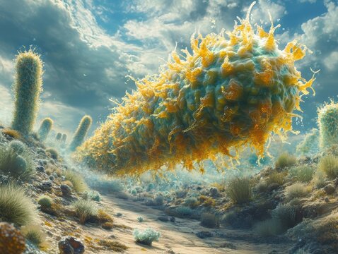 Microscopic virus cells are depicted in vibrant, detailed digital rendering, showcasing their intricate structures and interactions within cellular environment. image evokes sense of scientific