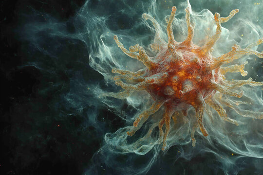 Futuristic scientific visualization of stem cells and microbiological structures in a medical context, enhanced with blur effects and viral imagery