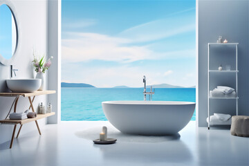 minimalist luxury bathroom with ocean theme, large bathtub, futuristic basin and shower, white towels, cosmetic racks and large mirror, two chair and little table with flower, hyper realistic,