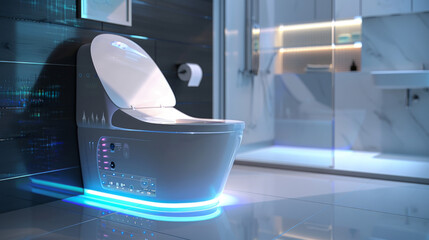 A futuristic bathroom design with a smart toilet, motion-activated faucets, and a digital shower control panel for ultimate convenience