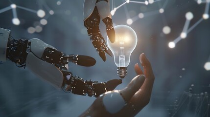 AI Machine learning Hands of robot and human touch on big data network Brain data creative in light bulb Science and artificial intelligence technology innovation for futuristic : Generative AI