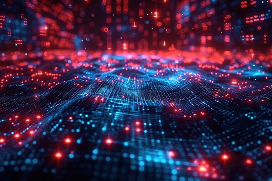A digital art piece featuring glowing 3D blocks in a vast array of pinks and reds symbolizing data or virtual reality concepts