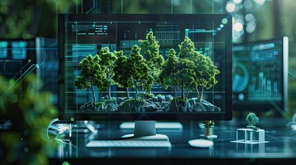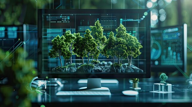 A computer screen displaying a digital forest landscape, symbolizing the integration of technology and conservation efforts.