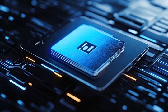 A glowing blue central processing unit surrounded by circuit board pathways in a dark, futuristic setting