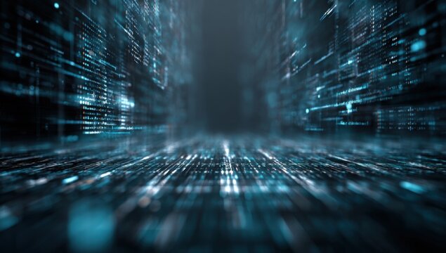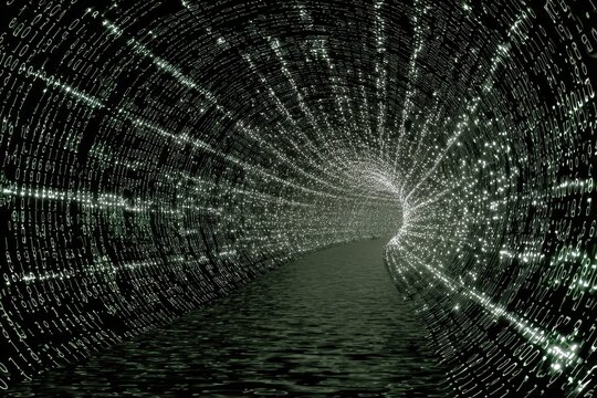 Exploring a digital tunnel filled with flowing binary code and glowing light waves in a futuristic setting