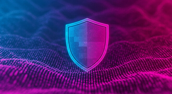Cybersecurity Shield on Digital Landscape, Representing Data Protection and Network Security in the Modern Technological Era, with Glowing Light Effect