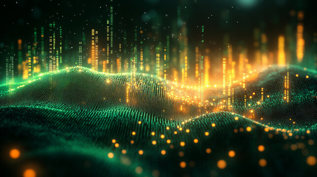 Abstract Binary Code Pattern with Dots in Green and Black Background Creating a Light Effect for Digital Art or Technology Concepts