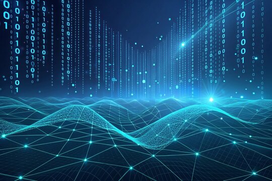 Abstract blue digital grid pattern forms virtual data tunnel. Light lines, binary code dots create tech network background. Futuristic design shows big data flow, internet, cyber space, information
