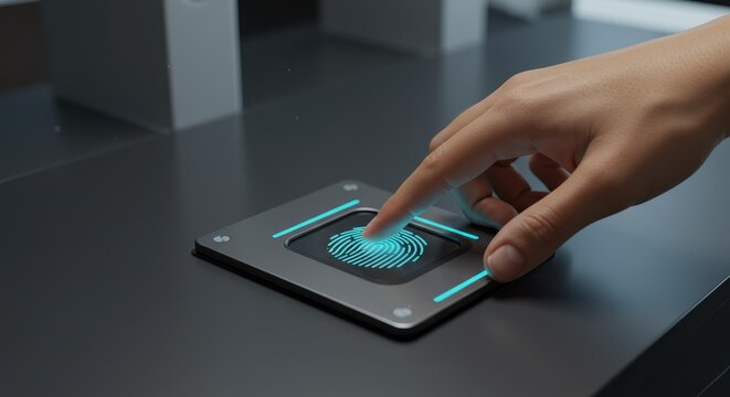 A close-up shot of a finger touching a glowing fingerprint scanner on a futuristic digital interface, symbolizing biometric security and advanced technology.