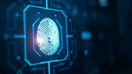A glowing fingerprint on a digital interface symbolizes high-tech biometric security system.