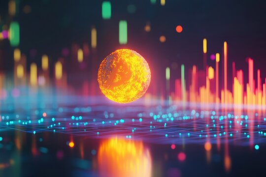 Illuminated bitcoin symbol amidst dynamic digital data chart