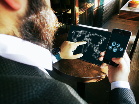 holographic network web world map between pro tablet and smartphone online e commerce shopping icons young adult bearded male in the bar pub