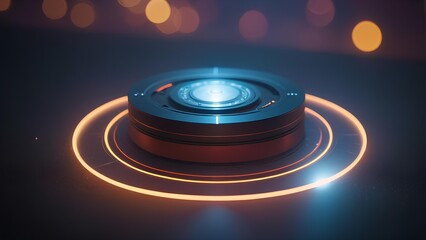 Futuristic circular podium with a glowing blue digital display and vibrant orange light, creating an advanced technological aesthetic for presentations and abstract concepts