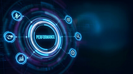 Displaying blue HUD showing donut chart, nodes and bars over blurred night skyline, percent labels