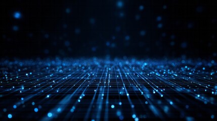 Mesmerizing glowing blue digital grid of reflective square tiles with floating bokeh lights and vertical light streaks, futuristic and immersive mood