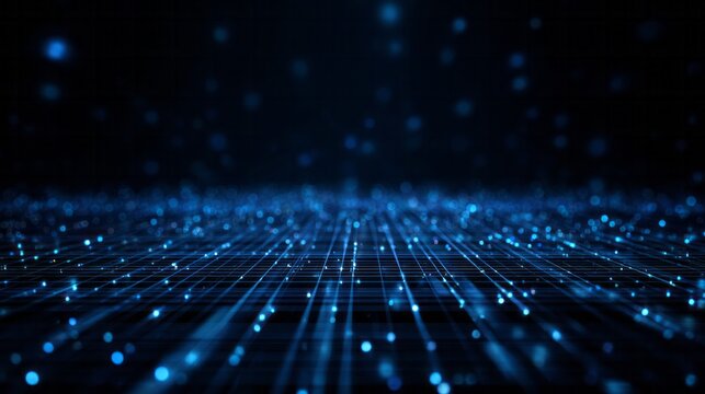 Illuminated digital grid lines extend into the deep dark background with floating orbs of light