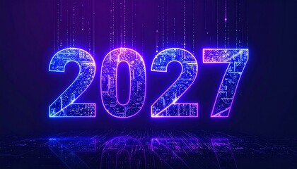 A futuristic representation of the year 2027 visualized with glowing neon blue digital circuitry and a reflective surface