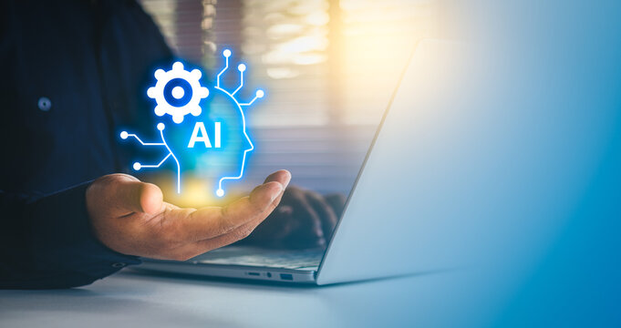 AI icon and laptop, artificial intelligence, digital brain, automation technology, business innovation, data integration, futuristic concept of AI-driven business innovation and digital transformation