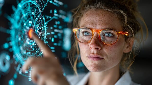 Intelligent businesswoman interacting with dynamic glowing digital interface, visualizing complex data in futuristic high-tech workspace