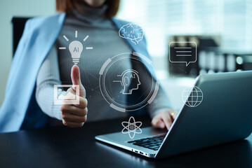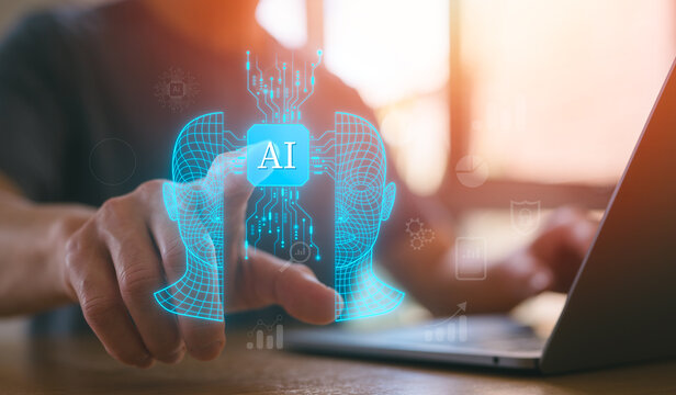 Businessman touching virtual AI icon with futuristic digital interface on laptop, representing artificial intelligence, machine learning, and innovative technology concepts.