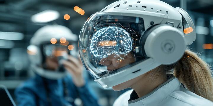 Two engineers wearing advanced helmets with digital brain interfaces work in futuristic lab, showcasing innovation and technology