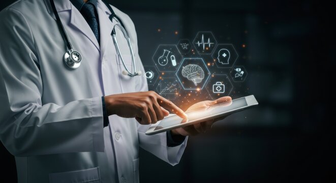 Doctor interacting with futuristic digital interface displaying medical icons and data, representing healthcare technology and innovation