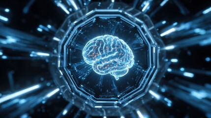 A glowing holographic human brain displayed in a futuristic glass cylinder with digital interface elements and blue energy effects.