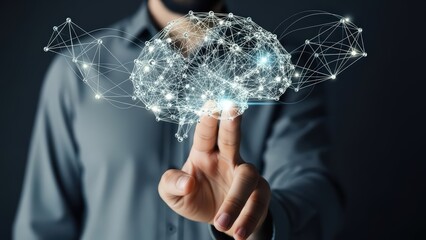 Intricate, luminous, digitally-rendered network of interconnected nodes forming a human brain shape, glowing with a soft blue light, is being gently touched by a human finger against a dark, blurred