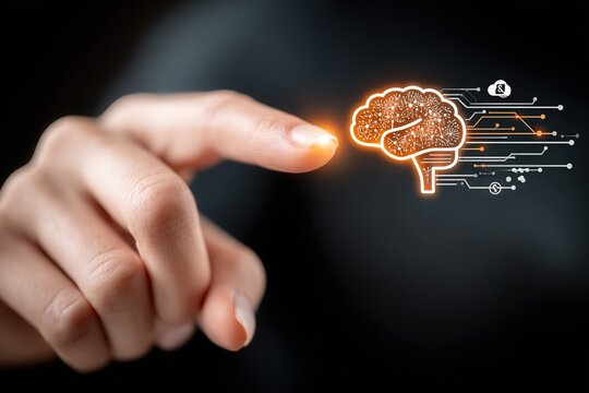 Hands touching glowing holographic brain with neon data lines in futuristic AI dashboard style on cinematic dark background.
