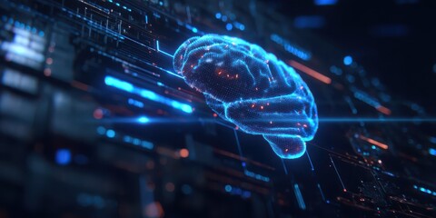Glowing Holographic AI Brain with Futuristic Neon Blue Lighting and Abstract Cloud Elements