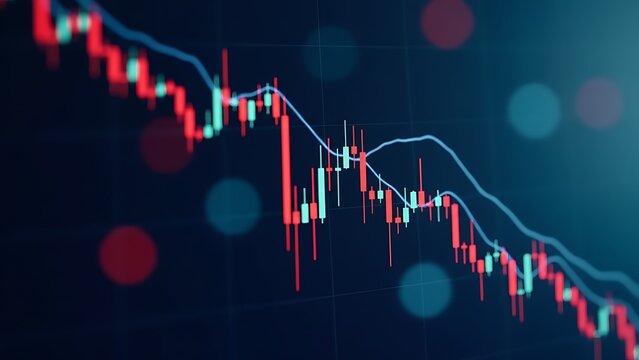 Futuristic financial graph with glowing candlestick bars and data panels