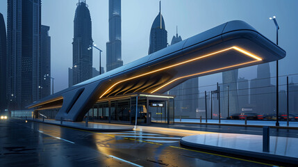 Sleek, illuminated bus station in a futuristic cityscape at night, with tall skyscrapers and a wet street reflecting lights
