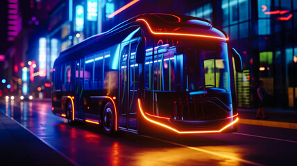 Sleek and ultra-modern self-driving autonomous electric bus on city street with neon lights and motion blur