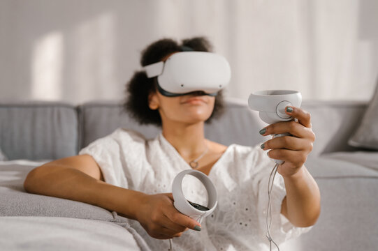 Glad black woman with controllers exploring virtual reality