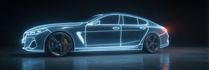 Futuristic car interface with digital wireframe design