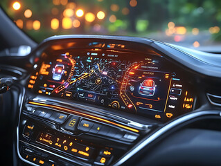 Sleek futuristic car dashboard with vibrant digital interface showcasing navigation, vehicle data, and entertainment controls.