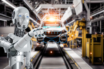 iot industry 4.0 concept.Smart factory using automation robotic arms with augmented mixed virtual reality technology to show data with artificial intelligence user interface (ui) while operation line