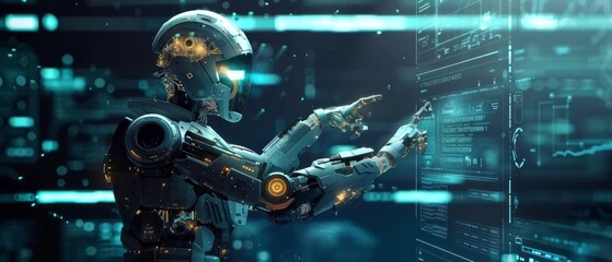 Futuristic high-speed light effect: android cyborg in metaverse world programming on hud interface