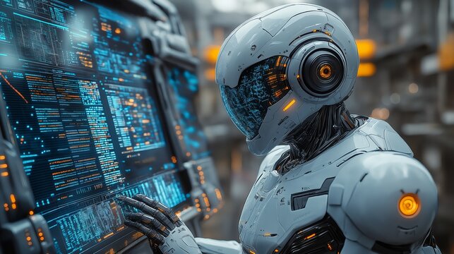 Futuristic robot analyzing complex data on a digital interface in a high-tech control room