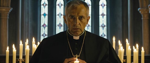 Interior of a futuristic Catholic cathedral robotic candles lighting up as a sharpeyed priest in a closeup delivers a sermon